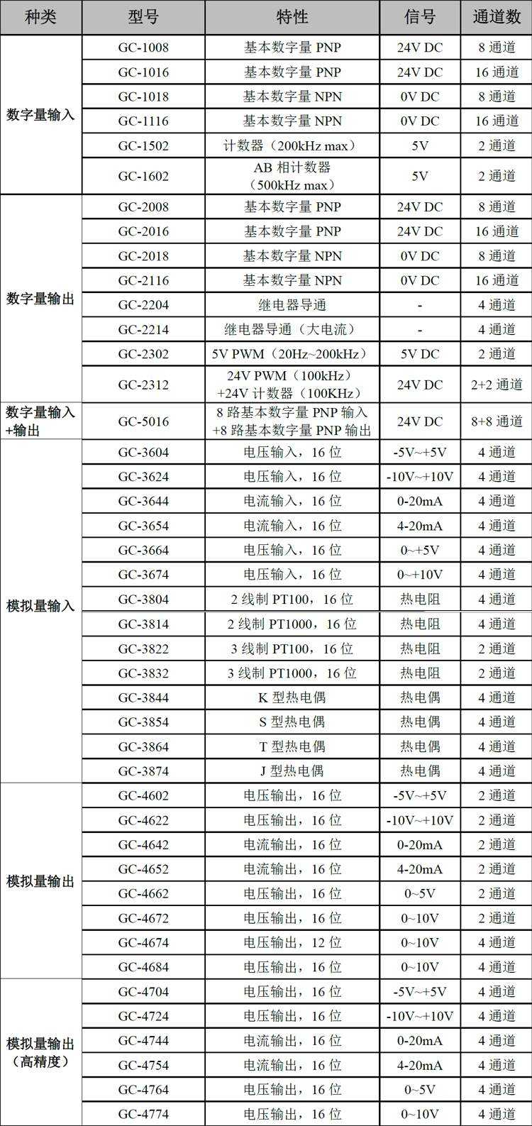 GC系列IO模块目前包括:数字量输入、数字量输出、模拟量输入、模拟量输出、通讯扩展五大类,具体的选型表如表6.1所示。