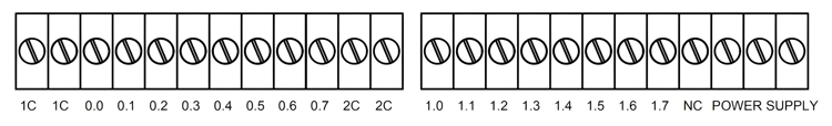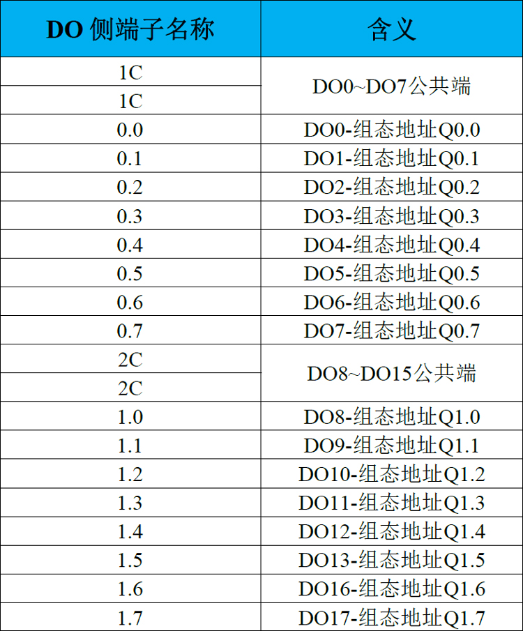 GCAN-PLC-326E/R系列的主控模块含有上下两排端子排,上方端子排包含DO端子排,DO端子排分别为Q0.0~Q0.7,Q1.0~Q1.7共16个数字量输出点,其中DO0、DO1为PNP数字量输出及PWM高速脉冲输出复用接口,以及供电接口,以及4个输出点公共端,其中两个1C为Q0.0~Q0.7的公共端,2个2C为Q1.0~Q1.7的公共端,为防止发热过多固将每个公共端接出2个引脚,接口定义如图所示。