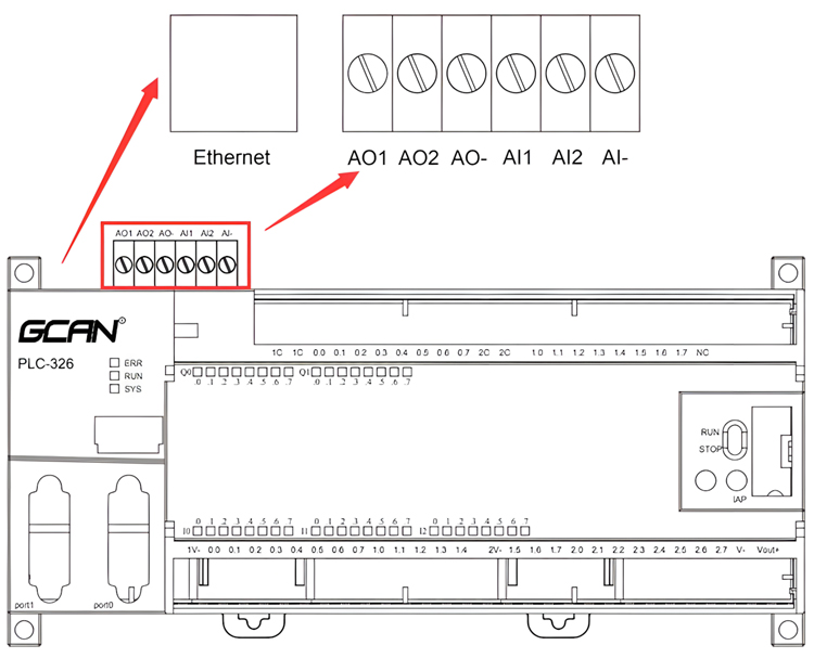 GCAN-PLC-326E/R系列的主控模块含有一个以太网接口以及一组模拟量接口接线端子排,如图所示。