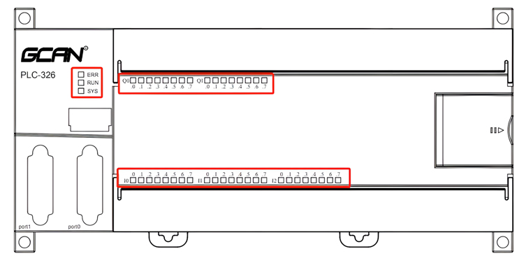 GCAN-PLC-326E/R系列具有三组指示灯,分别为系统状态指示灯、DI状态指示灯、DO状态指示灯。