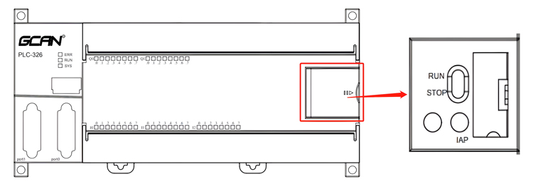 GCAN-PLC-326E/R提供1个程序运行开关和1个复位按钮。打开图示盖板后开关及按键位置如图4.1所示。