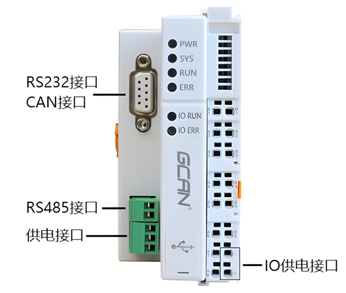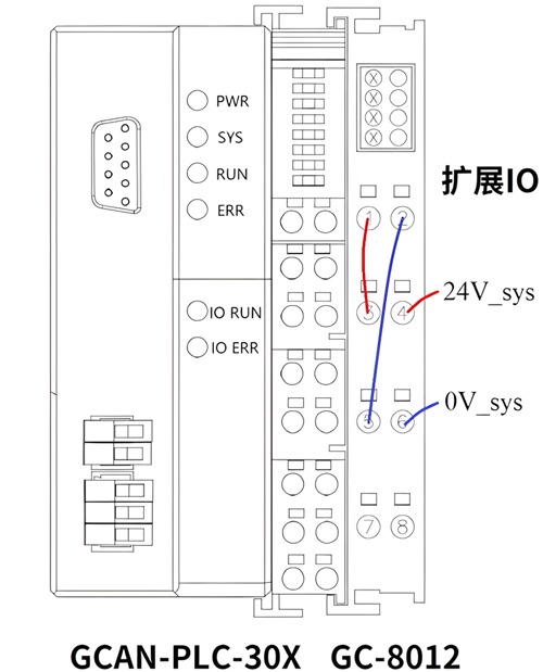 按下图接线即可,无需再给GCAN-PLC主体及自带IO供电。
