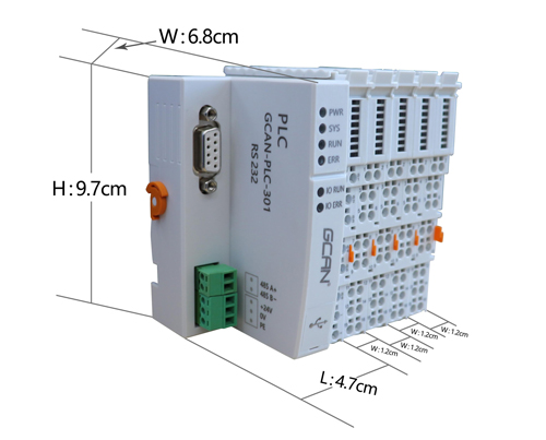 GCAN-PLC-301/302 系列产品由一个可编程的主控模块、若干GC 系列IO模块以及一个终端电阻模块组成。