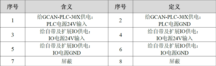表2.3 GCAN-PLC-301/302的电源端子定义
