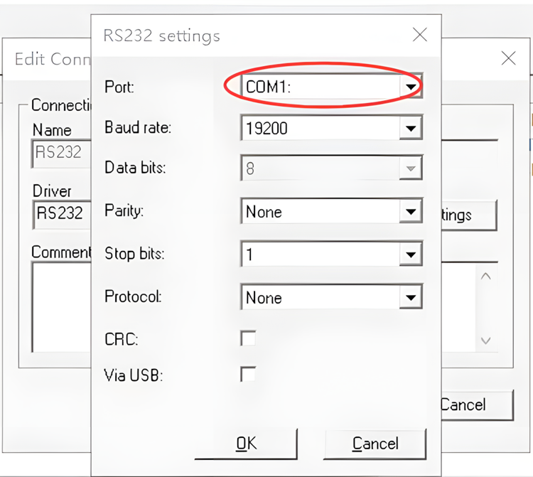 6、Port(端口)请选择USB-Enhanced-SERIAL-A对应的端口,支持小于等于COM9(详见第4章),波特率固定为19200,设置好后点OK。