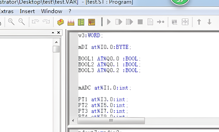 完成变量定义后便可在下方的编程界面开始编程了,下面为用ST 编写的简单例程语句: