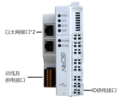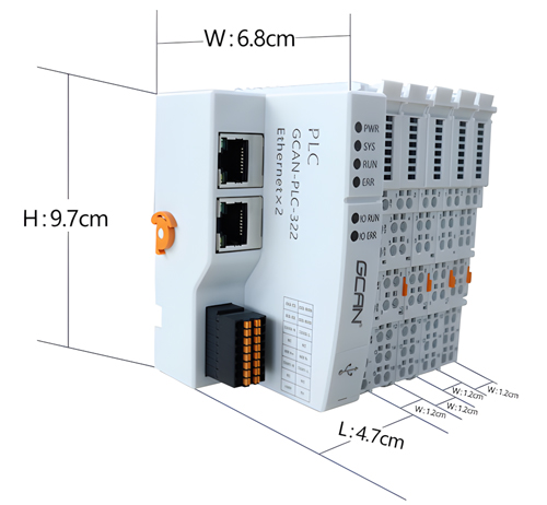 GCAN-PLC-320/321/322系列产品由一个可编程的主控模块、若干GC系列IO模块以及一个终端电阻模块组成。
