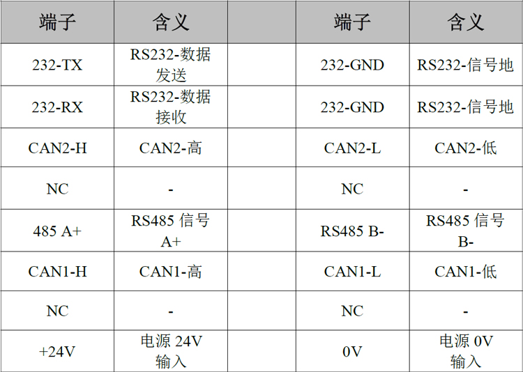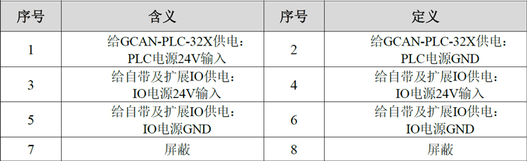 表2.1 GCAN-PLC-320/321/322的通信与供电接口定义