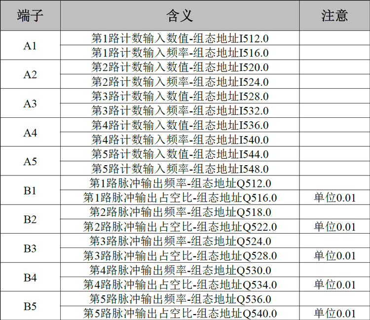 当A1~A5作为高速计数输入使用,B1~B5作为高速脉冲输出使用时。OpenPCS的高速输入输出组态定义见表2.3。