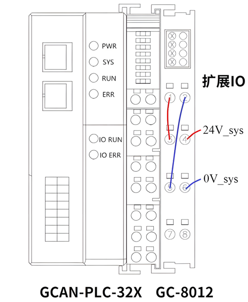 按下图接线即可,无需再给GCAN-PLC主体及自带IO供电。
