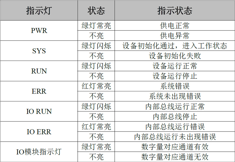 GCAN-PLC-320/321/322的IO模块未设置错误指示灯,请通过“IO RUN”和“IO ERR”指示灯来判断IO模块的状态。若GCAN-PLC-320/321/322的“IO ERR”指示灯亮起,表示IO模块为不正常工作,请优先检查模块安装情况。