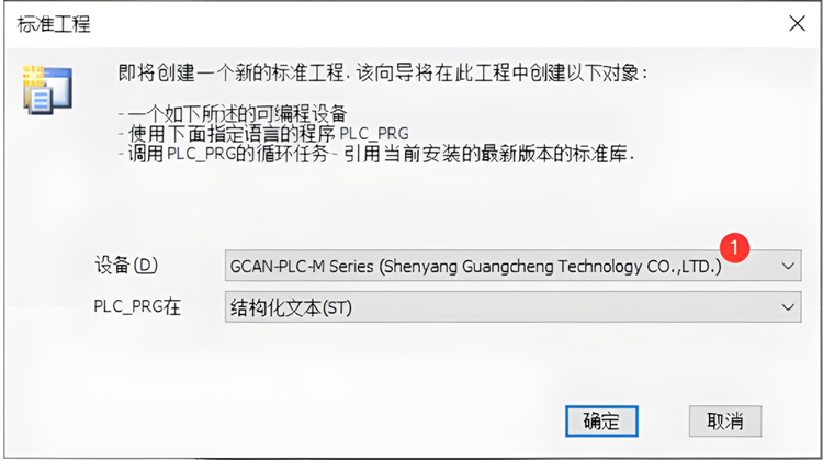 菜单工具栏-> 文件-> 新建工程, 创建Standard project , 设备选择“GCAN-PLC-M”,如下图所示。