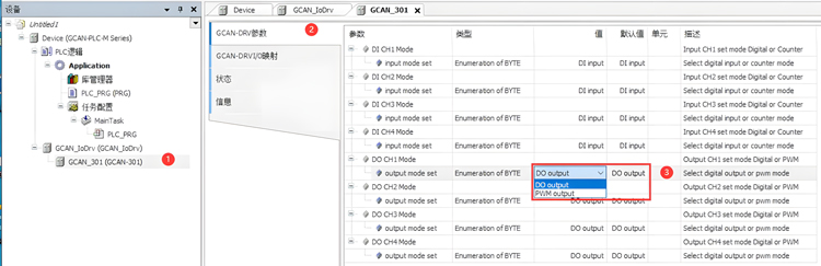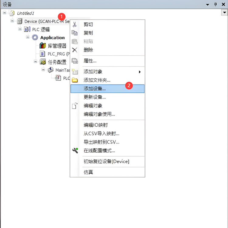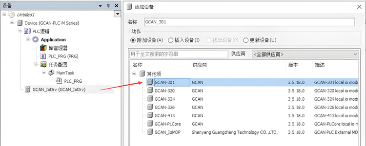 设备/ POU 窗口->Device 右键->添加设备,选择GCAN_IoDrv;