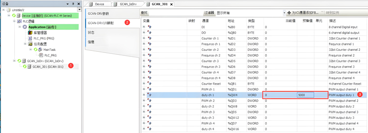 GCAN_320(GCAN-301)->GCAN-DRVI/O 映射,请注意占空比单位为0.01,即设置5000 时为占空比50%。