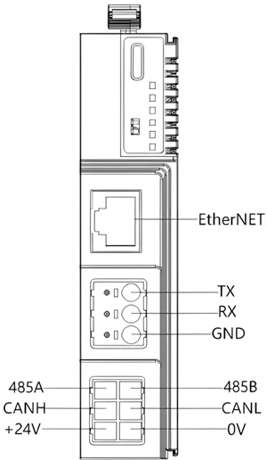 GCAN-PLC-325可编程逻辑控制器的总线及电源接线端子排如图2.7所示。GCAN-PLC-325可编程逻辑控制器各个端子对应的序号及其含义如表2.1所示。