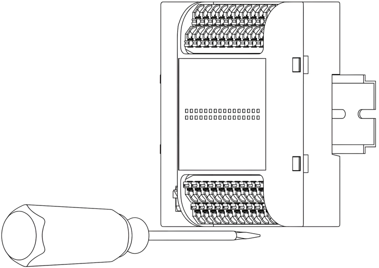 先将模块下方的导轨卡扣用一字螺丝刀拉出;然后将模块挂到DIN导轨上,并使用一字螺丝刀将下方的导轨卡扣推进去锁定,如图所示: