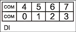 上方两排端子为DI端子排,分别为DI0~DI7,DI8~DIF共16个数字量输入点,以及4个DI的COM接口(4个COM口内部已短接,任意连接1个即可),如图所示。各个端子对应的序号及其含义如表2.5所示。