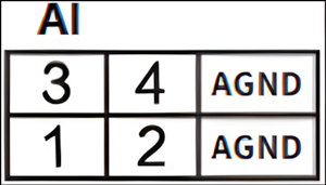 下方两排端子排的左侧为AI端子排,分别为AI1~AI4两个模拟量输入点,以及2个模拟量的公共端AGND接口(2个AGND口内部已短接),如图所示。AI及AGND端子对应的序号及其含义如表2.6所示。