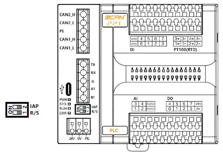 GCAN-PLC-221提供1个程序运行开关和1个复位按键。如图4.1所示: